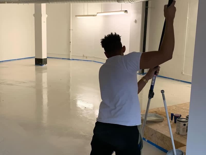 (clockwise) Ferg painting the floors, Kre8’s lounge/art gallery, Trel welcoming event guests.