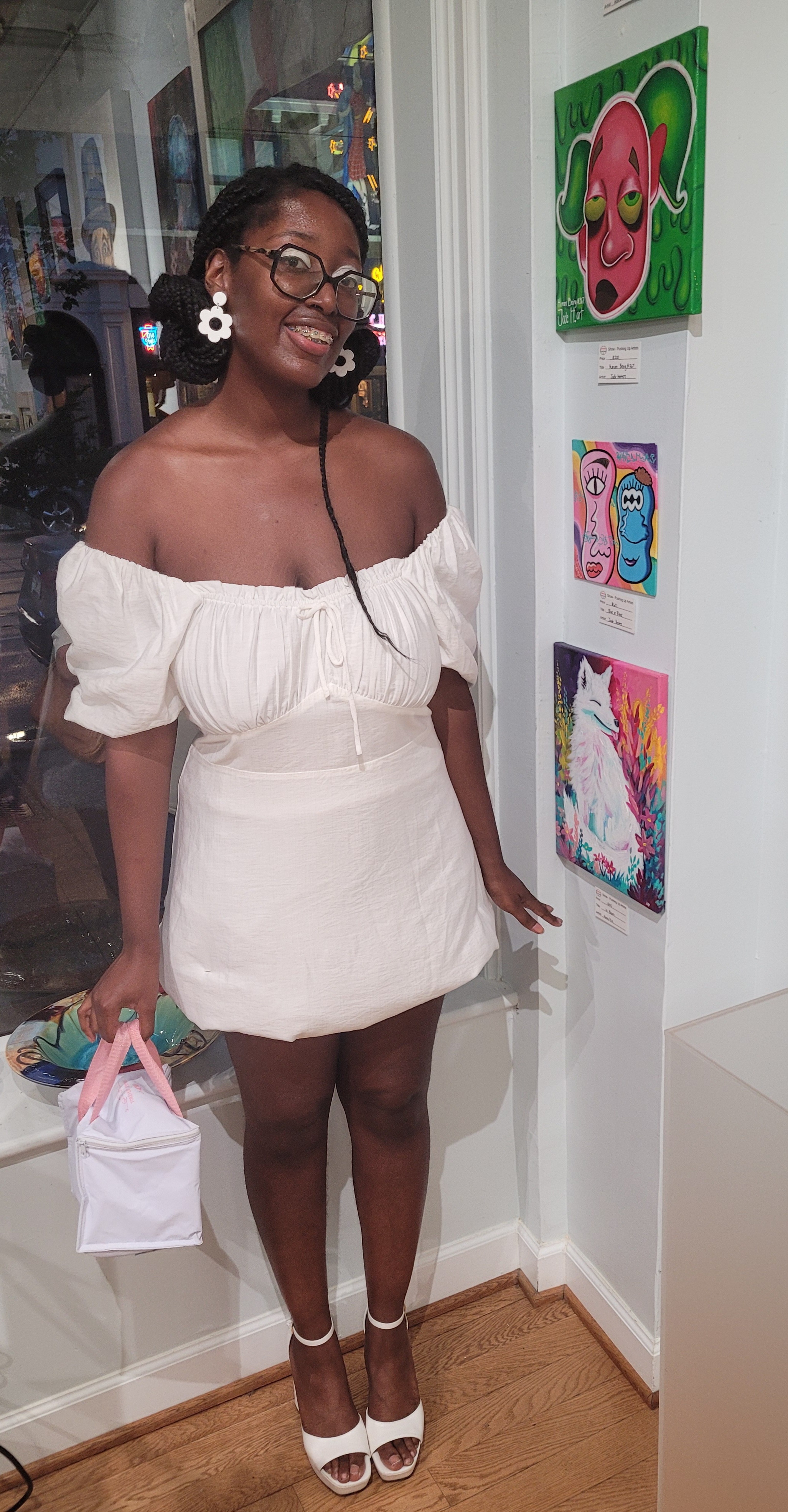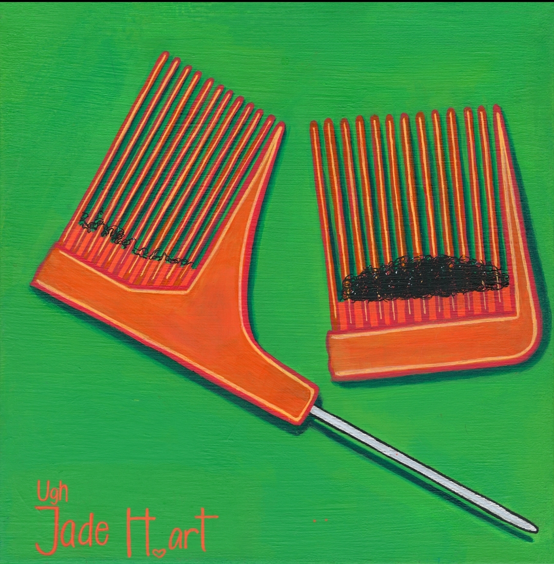 “I have a really big personality.”, she adds. “I think that also comes out in my art. Not just because I’m trying to, but because it just flows out of who I am.” Jade’s pieces have been featured in various local exhibitions, businesses and galleries, including Amor Tattoo and The KRe8 Place. Her pieces are also currently featured in St. Louis’ premier art infused inn, Angad Arts Hotel, and upcoming in Espresso Yourself Cafe’. “My first painting where I went “public” with my art, was this painting of a broken comb called, “Ugh”. People really liked that one because they saw themselves and their own experiences in it.”
