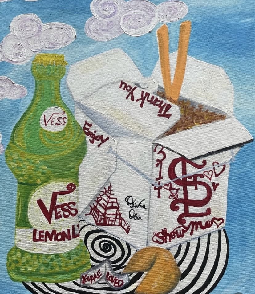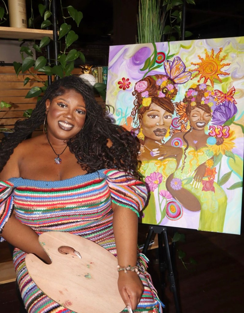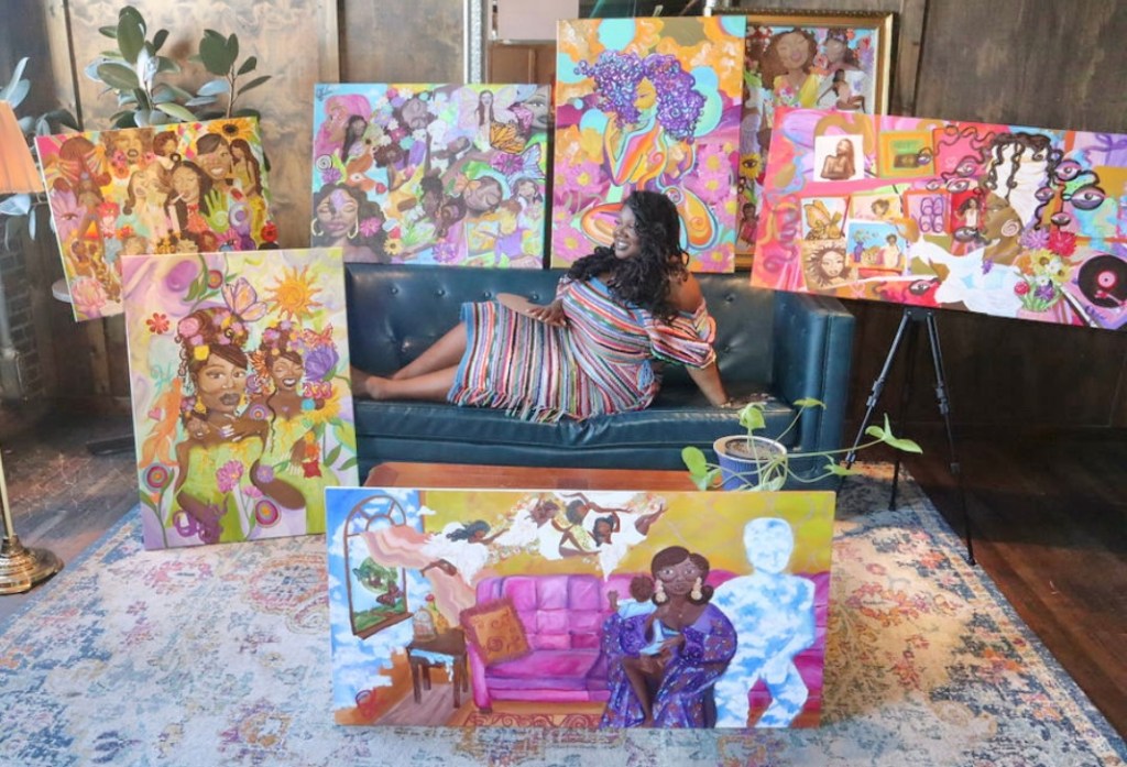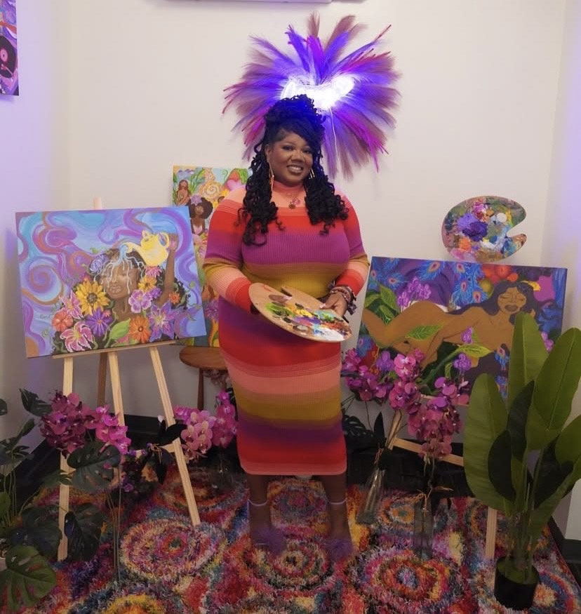 The 28 yr. old artist is known for curating colorful and vibrant pieces of black women in particular in unique composition. “I kind of get my color pallets from like old album covers that I remember from my childhood.”, she explains. “My artistic style is abstract and colorful. To invite light and joy into the room. If I’m doing a portrait painting, it would be more detail and realism. Sometimes I mix realism and abstract together.” Olivia is also an art workshop instructor and teacher at Kairos Academies in south St. Louis.