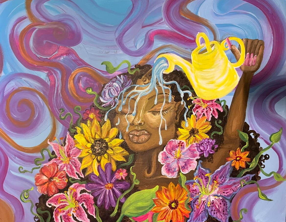 “I want people to feel free when they look at my work.”, says the painter. “Calm, joy, hope, and peace. On our journey we as people experience so many hard things. Sometimes I feel like America wants to just remind us of it. So, I want my art to be a complete alternate reality from that. Kind of go into your own world.” Her work has been featured in several local exhibitions, galleries and venues, such as The City Museum, Art St. Louis, The Luminary, and The KRe8 Place.